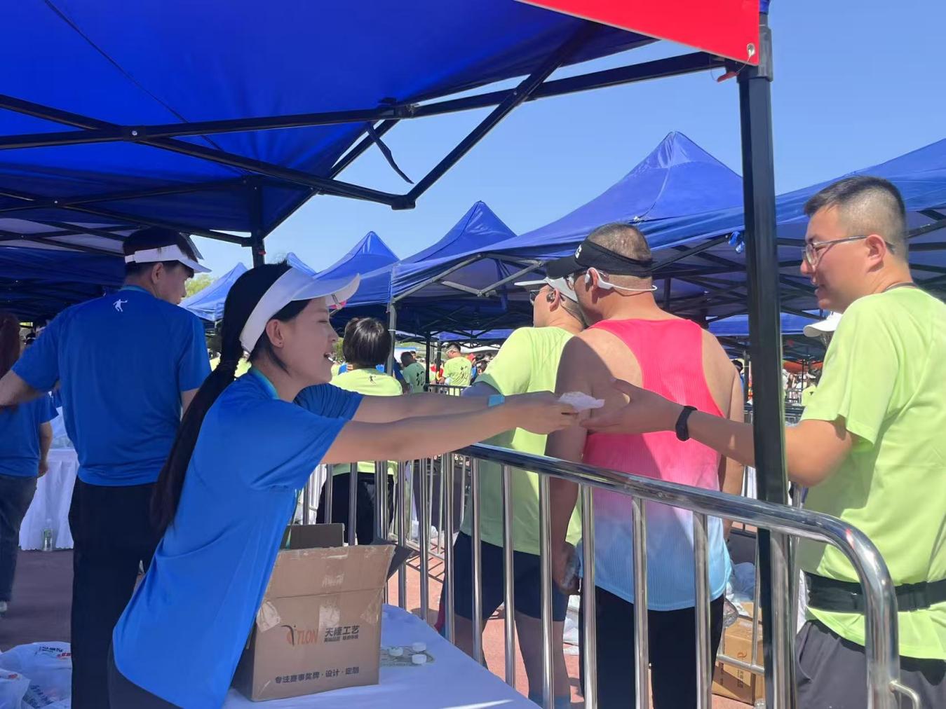 寧夏體育職業學院運動康復專業學生李曉陽在25公里補給站前細心調整降溫海綿的濕度:“天氣炎熱,海綿要浸透后擰至不滴水,這樣既能快速降溫又不會讓選手衣服濕透加重體熱?!彼贿吔榻B,一邊利落地為跑者遞上冰毛巾。這嫻熟專業的服務,源于學院連續兩年組織參與馬拉松志愿服務的扎實積累。